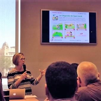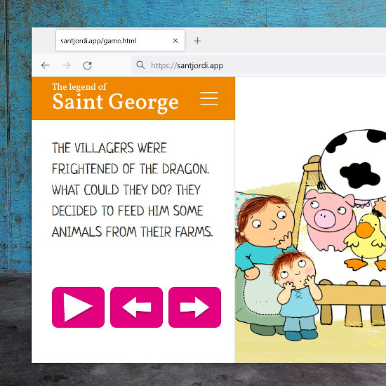 2010El dia de San Jorge, en que las calles de Barcelona se llenan, como cada año, de rosas y libros, se proponen crear una app infantil trilingue para celebrar esta tradición tan bonita y que sea útil para familias o escuelas que quieren conocer mejor San Jorge y que además, ayude a aprender y practicar inglés, catalán y español. 2010A la diada de Sant Jordi, en què els carrers de Barcelona s'omplen, com cada any, de roses i llibres, es proposen crear una app infantil trilingue per celebrar aquesta tradició tan bonica i que sigui útil per a famílies o escoles que volen conèixer millor Sant Jordi i que a més, ajudi a aprendre i practicar anglès, català i espanyol. 2010On Saint George’s Day, in which the streets are filled with couples buying books and red roses to celebrate Saint George in Catalonia, they decide to create a trilingual children’s app to celebrate this lovely traditiona and which would be useful for families or schools that want to learn about the story of Saint George and which would also help learn and practice English, Catalan and Spanish.